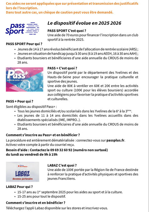 - PASS'SPORT : Nouveau dispositif en 2025-2026 : Aide de 70€ pour les enfants à partir de 14